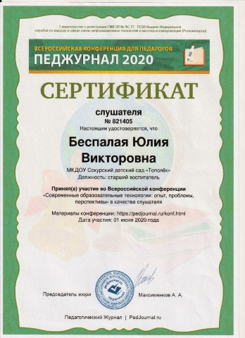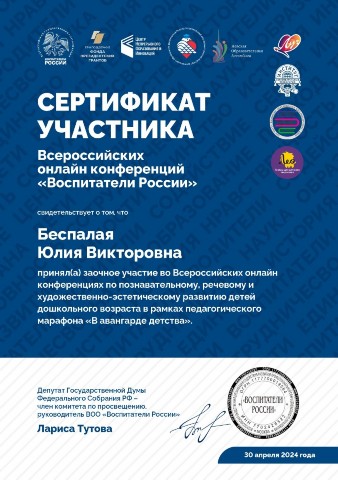 Заочное участие во Всероссийских онлайн конференциях по познавательному, речевому и художественно-эстетическому развитию детей дошкольного возраста в рамках педагогического марафона «В авангарде детства».