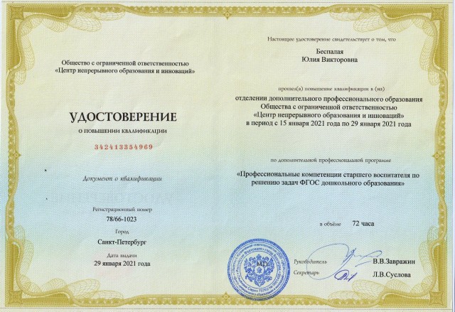29.01.2021г, ООО "Центр непрерывного образования и инноваций" по теме "Профессиональные компетенции старшего воспитателя по решению задач ФГОС дошкольного образования" 72ч |