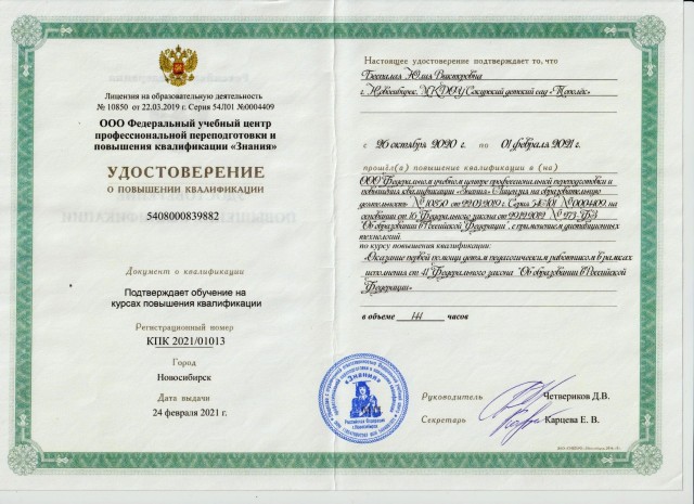 24.02.2021г, ООО Федеральный учебный центр профессиональной переподготовки и повышения квалификации "Знания" по теме "Оказание первой помощи детям педагогическим работником в рамках исполнения ст.41 Федерального закона "Об образовании в Российской Федерации", 144ч |