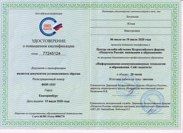 15.07.2020г, Центр онлайн-обучения Всероссийского форума "Педагоги России: инновации в образовании" по теме " "Информационно-коммуникативные технологии в образовании. сайт педагога", 20ч |