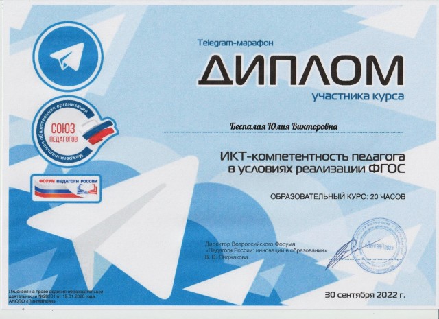 30.09.2022г, Центр онлайн-обучения Всероссийского форума "Педагоги России: инновации в образовании" по теме "ИКТ- компетентность педагога в условиях реализации ФГОС", 20ч |