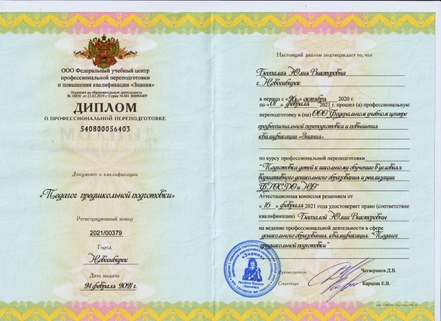 24.02.2021г, ООО Федеральный учебный центр профессиональной переподготовки и повышения квалификации "Знания" по курсу переподготовки "Подготовка детей к школьному обучению в условиях вариативного дошкольного образования и реализации ФГОС ДО и НО", квалификация - Педагог предшкольной подготовки. |
