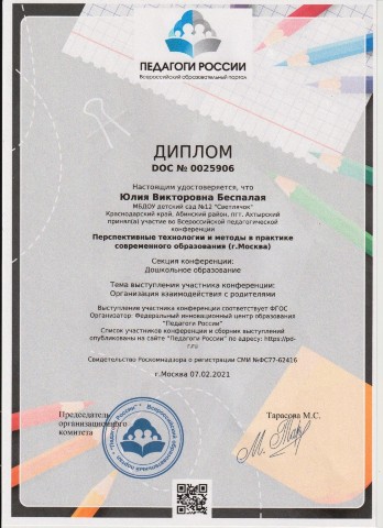 Участие во Всероссийской педагогической конференции "Перспективные технологии и методы в практике современного образования", тема выступления "Организация взаимодействия с родителями" |