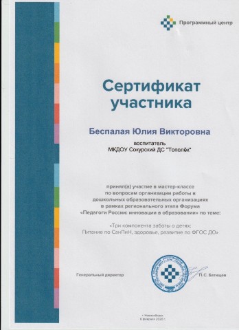 Участие в мастер-классе по вопросам организации работы в ДОО в рамках регтонального этапа Форума "Педагоги России: инновации в образовании" по теме "Три компонента заботы о детях: Питание по СанПиН, здоровье, развитие по ФГОС ДО" |