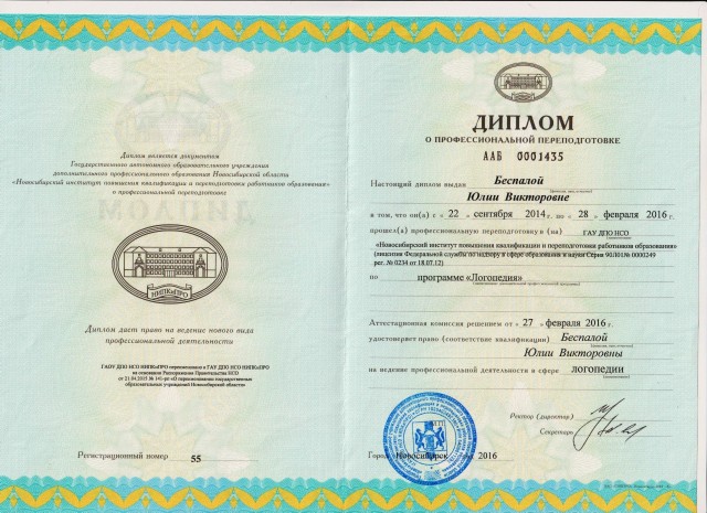 28.02.2016г, ГАУ ДПО НСО НИПКиПРО, переподготовка по курсу "Логопедия" |
