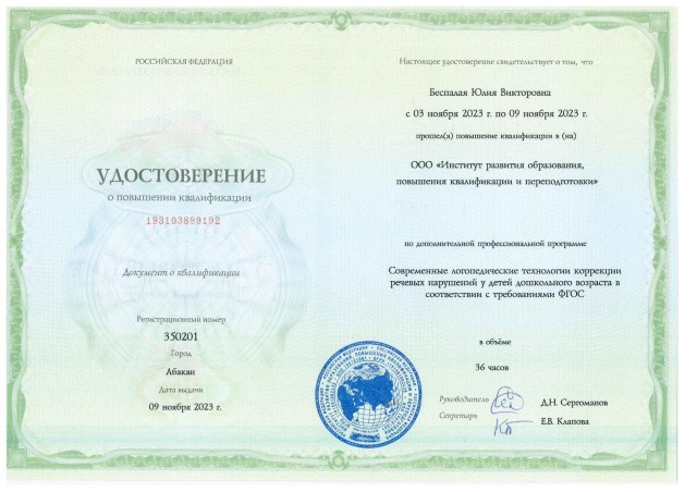 09.11.2023г, ООО "Институт развития образования, повышения квалификации и переподготовки" по теме "Современные логопедические технологии коррекции речевых нарушений у детей дошкольного возраста в соответствии с требованиями ФГОС", 36ч |