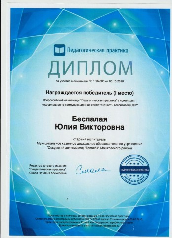 Диплом победителя (I место) Всероссийской олимпиады "Педагогическая практика" в номинации: Информационно-коммуникационная компетентность воспитателя ДОУ |