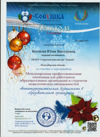 Диплом 1 степени за участие в мероприятии Международная профессиональная олимпиада для работников образовательных организаций и студентов педагогических специальностей