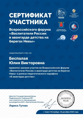 Заочное участие во Всероссийском форуме "Воспитатели России: в авангарде детства на берегах Невы"в рамках педагогического марафона "В авангарде детства" |