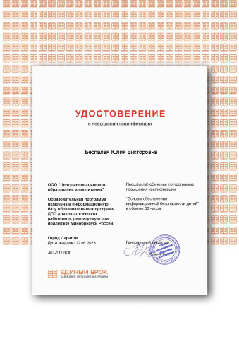 22.06.2023г. ООО "Центр инновационного образования и воспитания" по теме "Основы обеспечения информационной безопасности детей" 36ч |