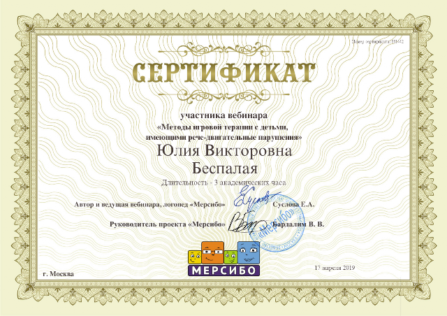 Участие в вебинаре "Представления о схеме тела как база формирования личности, поведения и когнитивных функций у детей: простые и эффективные методы в практике логопеда и психолога" |
