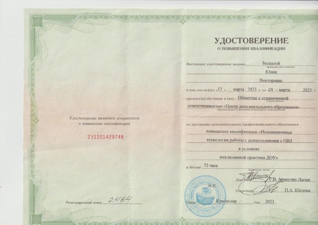 24.03.2023г, ООО "Центр дополнительного образования" по теме "Инновационные технологии работы с дошкольниками с ОВЗ в условиях инклюзивной практики ДОУ" 72ч |