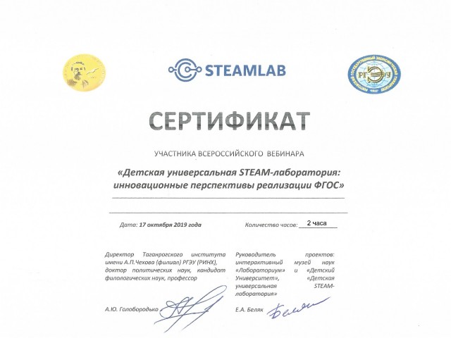 Участие в вебинаре "Детская универсальная STEAM -лаборатория: инновационные перспективы реализации ФГОС" |