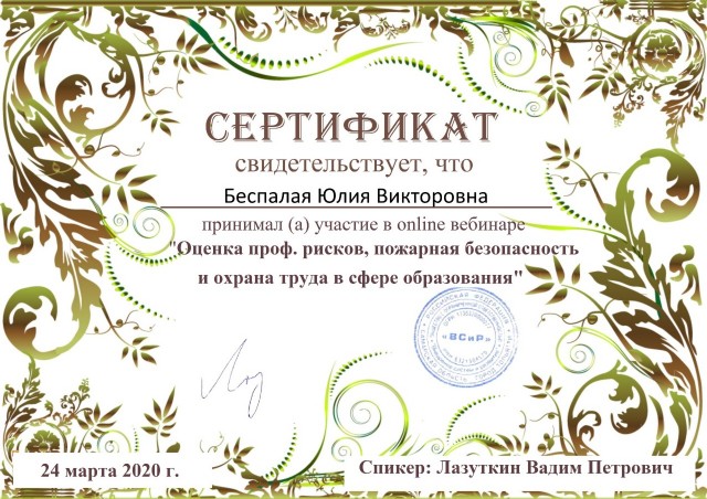 Учестие в онлайн вебинаре ""Оценка профессиональных рисков, пожарная безопасность и охрана труда в сфере образования" |