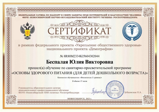 28.02.2023г. ФЕДЕРАЛЬНАЯ СЛУЖБА ПО НАДЗОРУ В СФЕРЕ ЗАЩИТЫ ПРАВ ПОТРЕБИТЕЛЕЙ И БЛАГОПОЛУЧИЯ ЧЕЛОВЕКА ФБУН «НОВОСИБИРСКИЙ НАУЧНО-ИССЛЕДОВАТЕЛЬСКИЙ ИНСТИТУТ ГИГИЕНЫ» РОСПОТРЕБНАДЗОРА по санитарно-просветительской программе «ОСНОВЫ ЗДОРОВОГО ПИТАНИЯ (ДЛЯ ДЕТЕЙ ДОШКОЛЬНОГО ВОЗРАСТА)», 15ч |