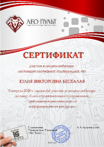 Участие в онлайн-вебинаре "Сайт образовательного учреждения. Требования и рекомендации к информационным ресурсам" |